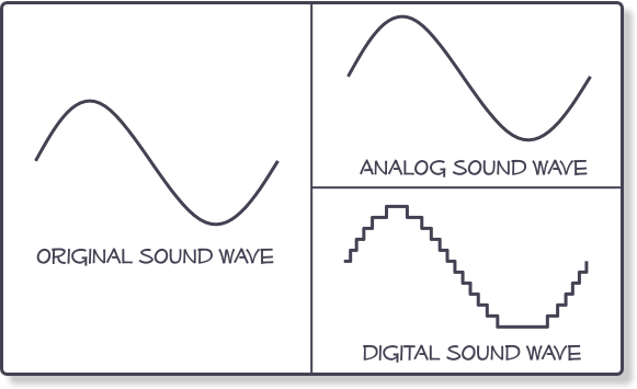 - Sound waves are analogue (meaning a continuous wave), but computers can only work with digital data.